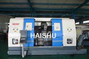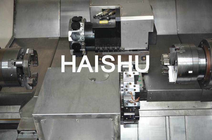 CNC350T two spindle two turret CNC turning center No. Item Unit specifications CNC350T 1 Max.rotation diameter on lathe’ body mm 350 2 Max.workpiece lengt mm 750/1000/1500 3 Max.turning diameter mm 300 4 Spindle nose type and code mm A8 5 2-Hydraulic chuck mm 2-φ200 (8") 6 Front spindle bore taper 1:20 7 Spindle bore mm 50 8 2- Servo spindle speed range mm/min 0-4000 9 X/Z/B Rapid traverse mm/min 40000 10 Cs1,Cs2 main servo motor power kW 7.5 11 C-axis(Turret power axis) motor power kw 3.7 12 X/Z-axis motor max.torque N.m 10 13 Y-axis travel(optional) mm +35/-35 14 B-axis(sub-spindle) motor max.torque N.m 15 15 Power specifications v 380±10%. 50Hz±1Hz 16 Turret transfer time (one station) s 1.6(Horizontal12) 17 Turret transfer repeat positioning accuracy mm 0.005" 18 X1/X2-axis travel mm 200 19 Z1/Z2-axis travel mm 1100/1350/1850 20 B-axis (sub-spindle) travel mm 1400/1650/2150 21 2-C axis(Turret power axis) max.speed rpm 4000 22 Biaxial dynamic docking concentricity mm 0.005 23 Ydraulic servo turret form 2-Horizontal 12-station power turret 24 Turret cylinder clamping force kg 4240 25 Turret hydraulic power source kg/cm² 40 26 Power tool holder specification VDI40 DIN5480 27 Knife handle size mm □20×20 28 Net weight kg 5500 29 Size(L×W×H) mm 2700/3000/3500×1650×1900 Standard configuration: ◆CNC system: GSK ◆Two servo spindle unit ◆Two hydraulic center solid chuck ◆Horizontal 12-station power turret ◆5-Axis line rail ◆Turning cooling system ◆Automatic lubrication system ◆The whole protection system Select Configuration: ◆CNC system: SYNTEC, Fanuc, Siemens ◆Increasing the Y-axis ◆Two hydraulic hollow chuck ◆Automatic feeder ◆Automatic chip conveyor ◆Automatic pick pieces equipment ◆Automatic protective door ◆Loading and unloading robots
